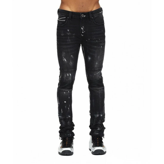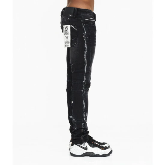 This black stretch punk super skinny style has a narrow leg from thigh to ankle. Crafted from a premium stretch denim then vintage washed with rips, 3M paint splatter, and repairs for a clean design. It features the cult signature selvage trim details and XX” embroidery on the back leg.