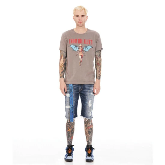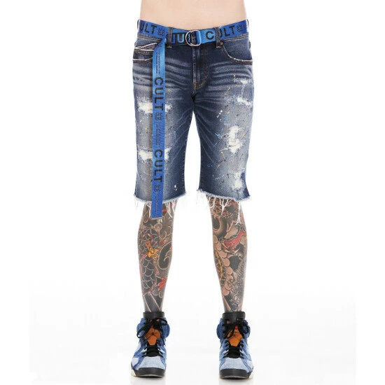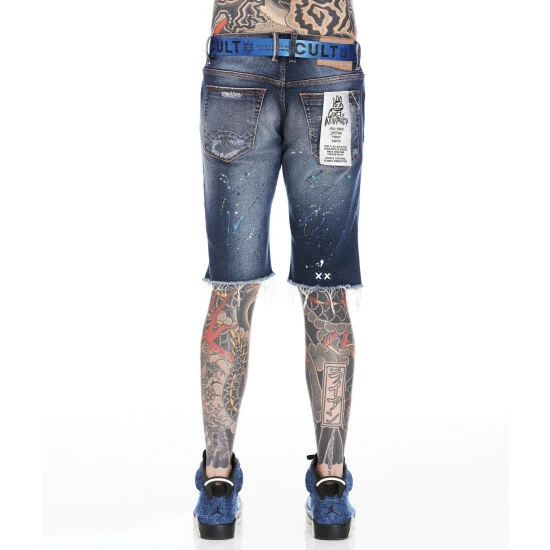 Slim-style shorts with a relaxed waist and a low rise. This dark blue rocker slim short is crafted from premium denim and a paint splatter vintage wash to create a unique denim color combination. The leg narrows from the knee to the ankle. Utility belt included.