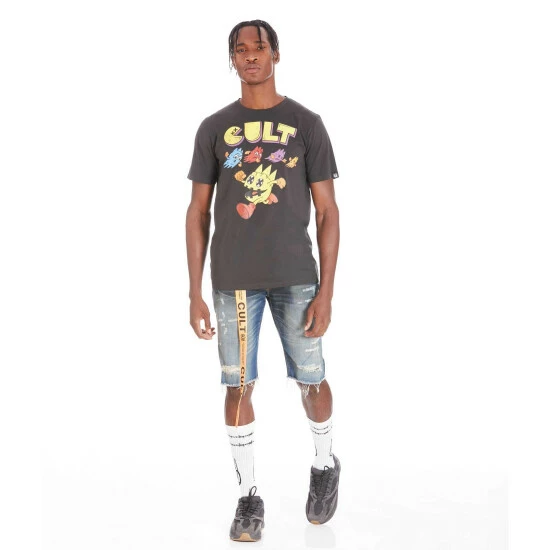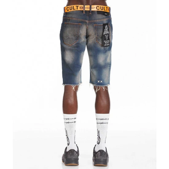 Slim-style shorts with a relaxed waist and a low rise. This medium blue rocker slim short is crafted from premium denim and vintage wash to create a unique denim color combination. The leg narrows from the knee to the ankle. Safety orange utility belt included.