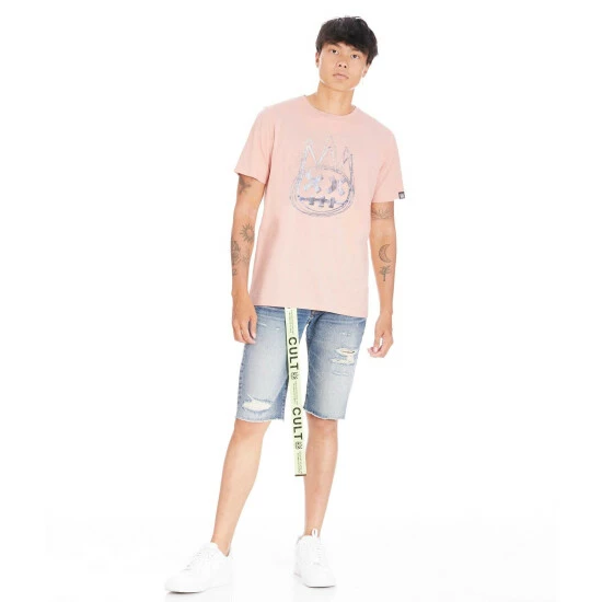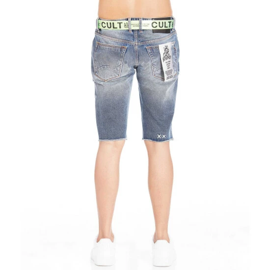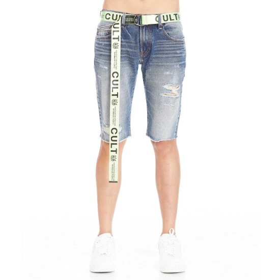 Slim-style shorts with a relaxed waist and a low rise. This light blue rocker slim short is crafted from premium denim and a neon color paint splatter and vintage wash to create a unique denim color combination. The leg narrows from the knee to the ankle. Neon green utility belt included.