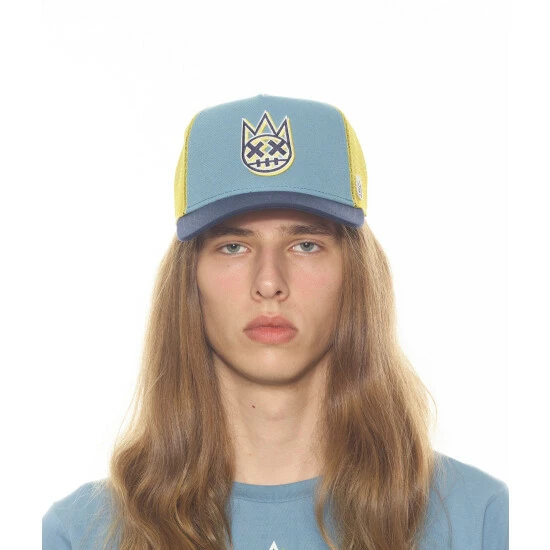 Mesh trucker cap built from durable wool acrylic fabric in blue heaven with a kiwi brim. The front of the hat is adorned with a 3D raised embroidery Shimuchan logo.