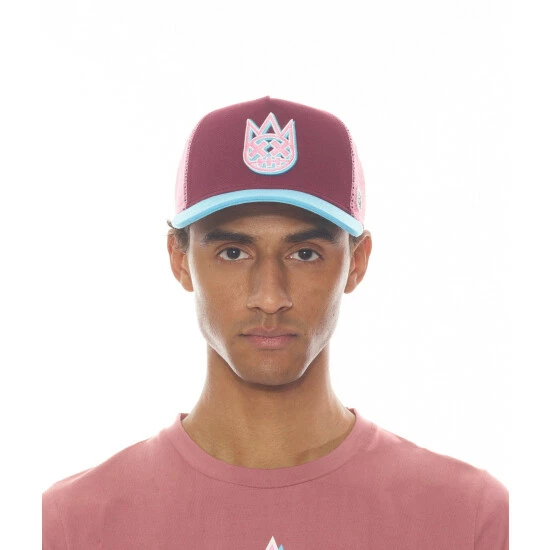 Mesh trucker cap built from durable wool acrylic fabric in deco rose with a blue atoll brim. The front of the hat is adorned with a 3D raised embroidery Shimuchan logo.