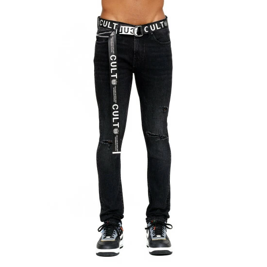 This utility belt sports all-over Cult logo branding in black. Its extra-long design fastens with a gunmetal d ring.