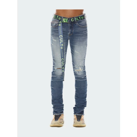 This utility belt sports all-over Cult logo branding in blue heaven. Its extra long design fastens with a gunmetal D-ring.