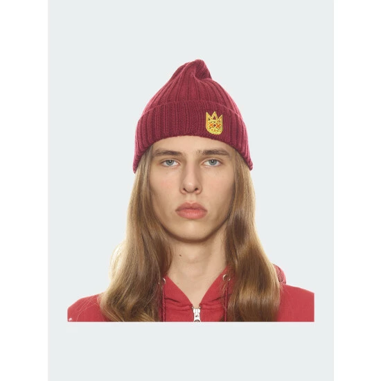 Garnet knitted poly-wool blend hat adorned with an embroidered Shimuchan logo on the front. Designed with a thick fold-over cuff to keep you warm.