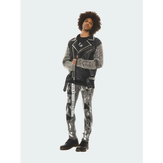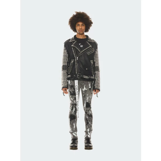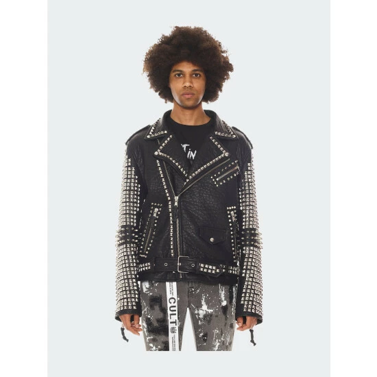 The signature vegan leather motorcycle jacket is adorned with silver metal pyramid studs throughout the jacket on the front, back, and sleeves.