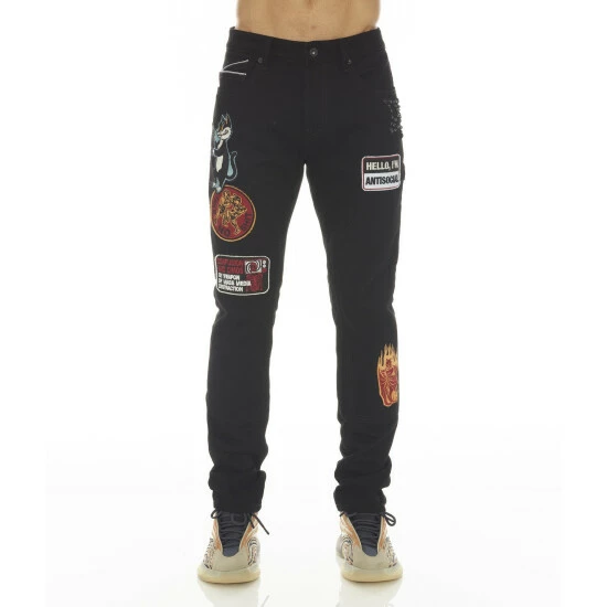 This double black stretch carpenter rocker slim style has a narrow leg from thigh to ankle. Crafted from premium rigid denim. It features the lucky bastard signature selvage trim details and multiple embroidered patches across the front as well as another patch and lucky bastard embroidered bat graphic on the back leg.