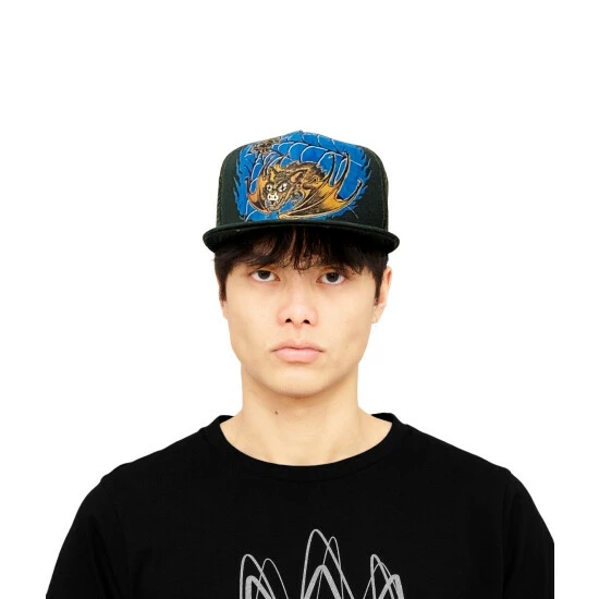 Mesh trucker cap built from durable wool acrylic fabric in black. It’s adorned with a printed lucky bastard graphic on the front.