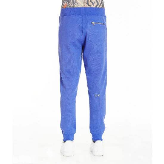 These surf blue sweatpants are cut from heavy french terry. AÂ small printed logo on the front in iridescent for a great combination. Zipper closure for front and back pockets