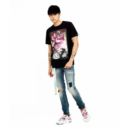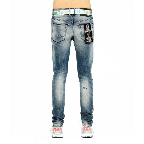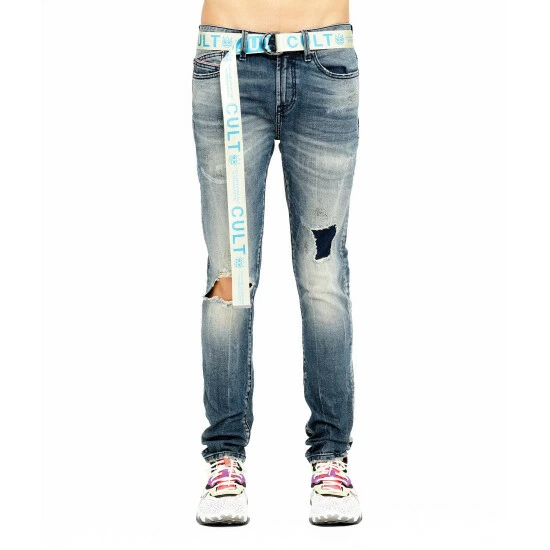 This dark blue stretch punk super skinny style has a narrow leg from thigh to ankle. Crafted from a premium stretch denim then vintage washed with rips and repairs for a clean design. It features the cult signature selvage trim details and XX” embroidery on the back leg. Utility belt included.