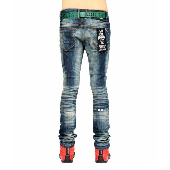 This dark blue stretch rocker slim style has a narrow leg from thigh to ankle. Crafted from a premium stretch denim then vintaged washed with rips and repairs. It features the cult signature selvedge trim details and XX.