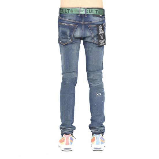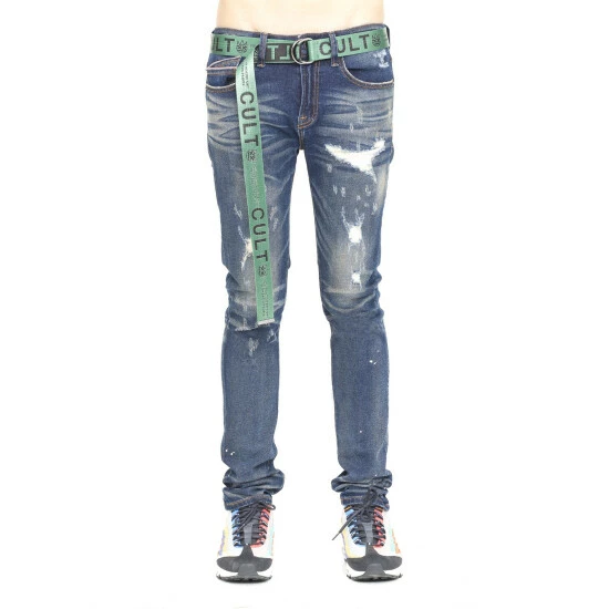 This medium blue punk super skinny style has a narrow leg from thigh to ankle. Crafted from a premium stretch denim then vintage washed with rips and repairs. A utility belt is included.