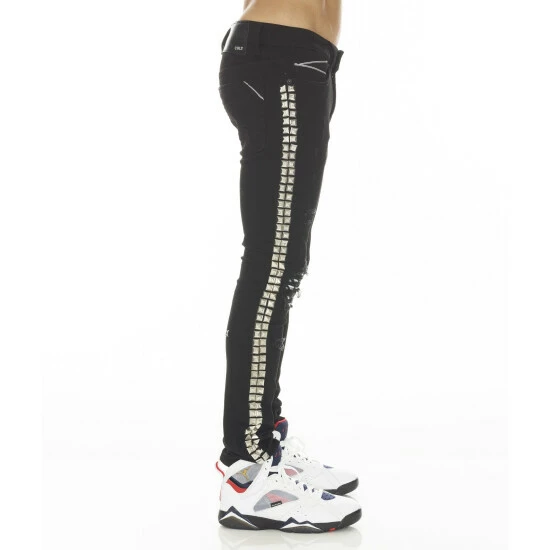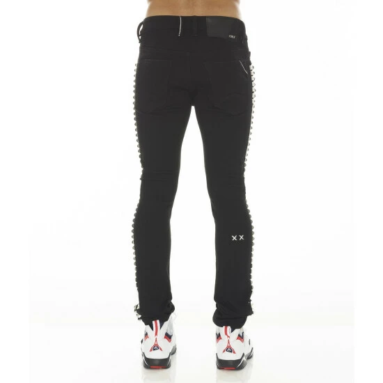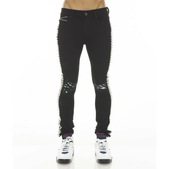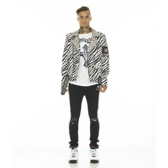 This double black stretch punk super skinny style has a narrow leg from thigh to ankle. Crafted from a premium stretch denim with vegan leather zebra printed piping detail on the knee openings for a clean design. It features the cult signature selvage trim details and XX embroidery on the back leg.