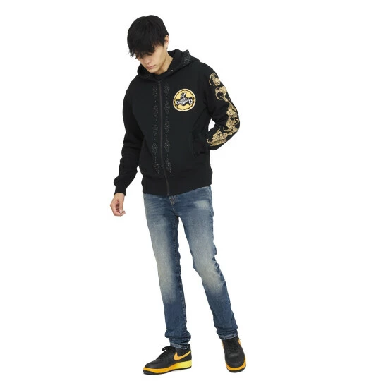This medium-dark blue punk super skinny style has a narrow leg from thigh to ankle. Crafted from a premium stretch denim then vintage washed with rips and repairs, andblack stud trims for a clean design.