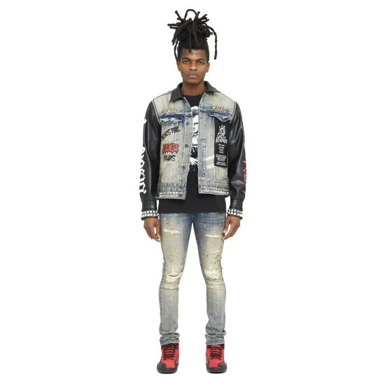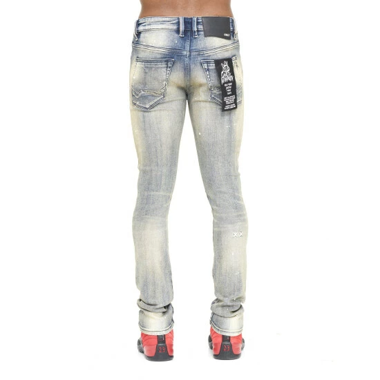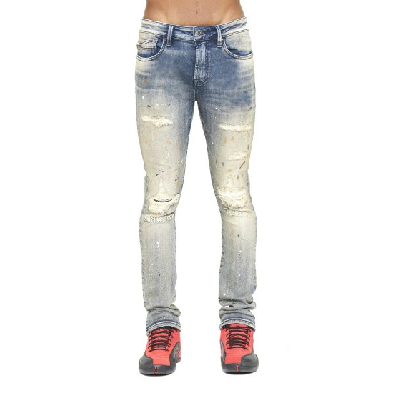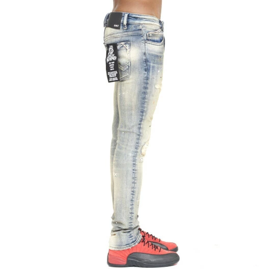 This medium dark blue punk super skinny style has a narrow leg from thigh to ankle. Crafted from a premium stretch denim then vintage washed with rips and repairs, and embroidery on the knees (silence turns to sirens) for a clean design.