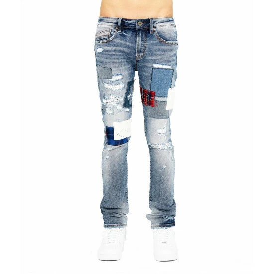 This light-dark blue punk super skinny style has a narrow leg from thigh to ankle. Crafted from a premium stretch denim then vintage washed with rips backed with matching plaid fabric, and repairs for a clean design.