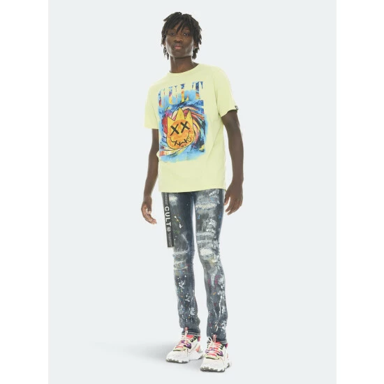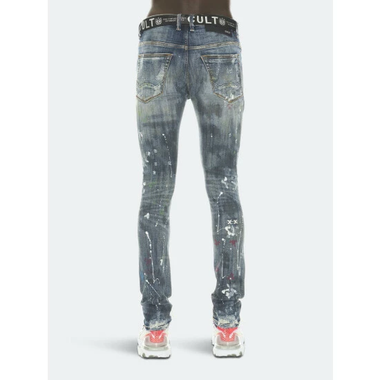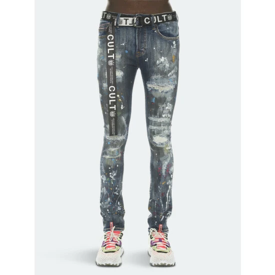 This medium blue stretch punk super skinny style has a narrow leg from thigh to ankle. Crafted from a premium stretch denim then vintage washed with rips, repairs, paint splatter, and embroidery for a clean design. It features the cult signature selvedge trim details and “Xx” embroidery on the back leg. Utility belt included.