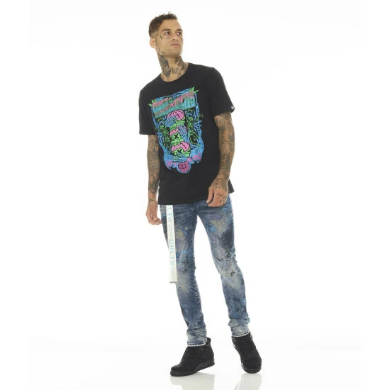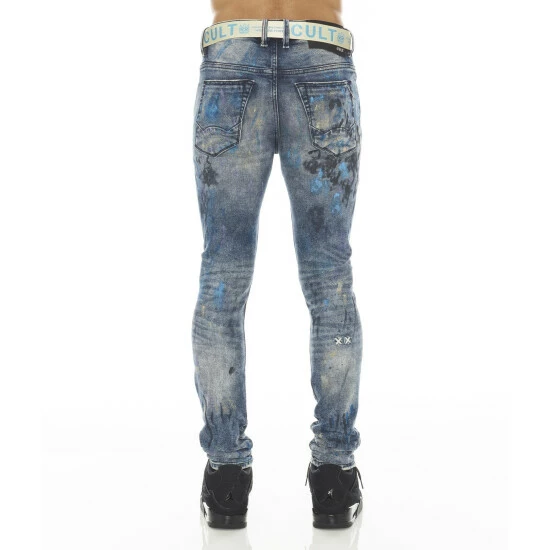 This medium blue stretch punk super skinny style has a narrow leg from thigh to ankle. Crafted from a premium stretch denim then vintage washed with a paint splatter pattern for a unique design. It features the cult signature selvedge trim details and “Xx” embroidery on the back leg. Utility belt included.