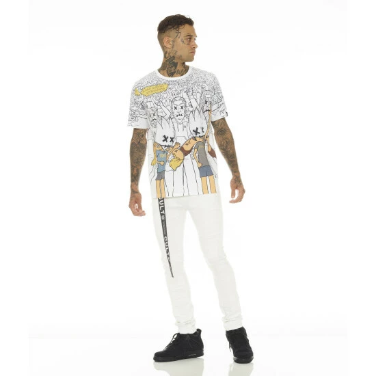 This white stretch punk super skinny style has a narrow leg from thigh to ankle. Crafted from a premium stretch denim then accented with rips, repair, and embroidery for a clean design. It features the cult signature selvedge trim details and “Xx” embroidery on the back leg. Utility belt included.