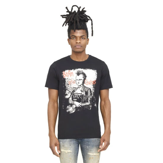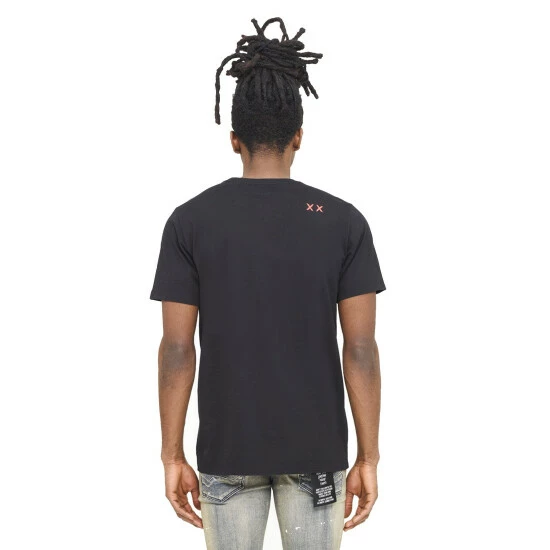 Cotton black t-shirt is adorned with a large Cult digital printed graphic on the front.