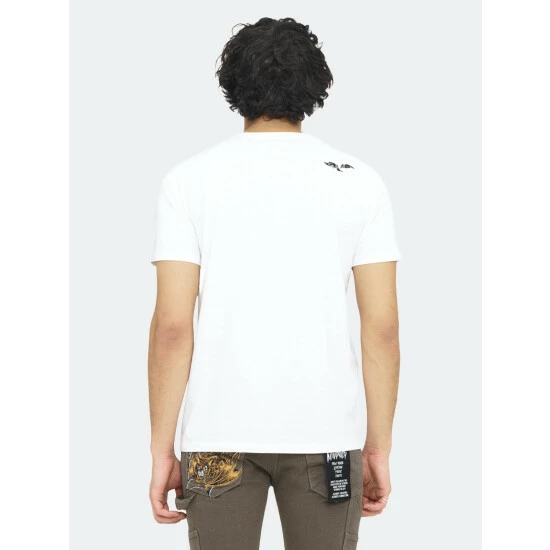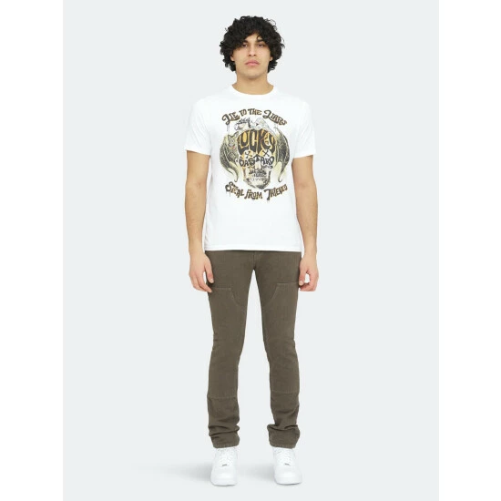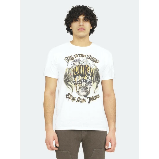 Cotton white t-shirt is adorned with a large lucky bastard digital printed graphic on the front.