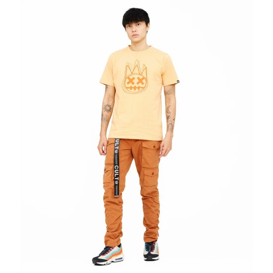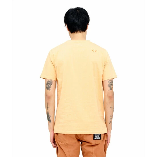 Cotton apricot t-shirt is adorned with a large contrast printed shimuchan logo.