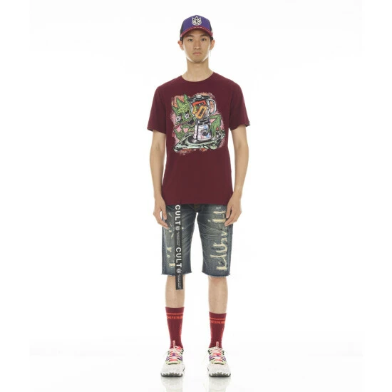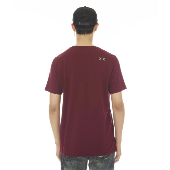 Cotton red t-shirt is adorned with a large printed Cult graphic on the front and printed “XX” on the back.