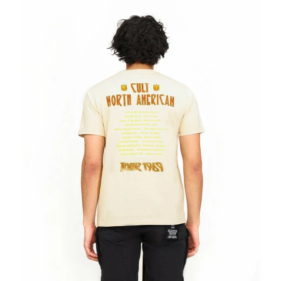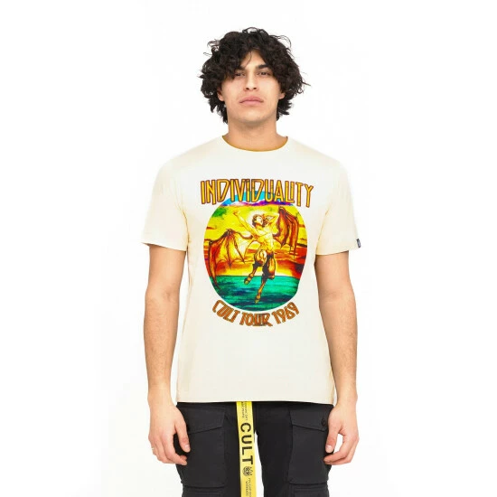 The cotton cream t-shirt is adorned with a large Cult digitally printed graphic on the front.
