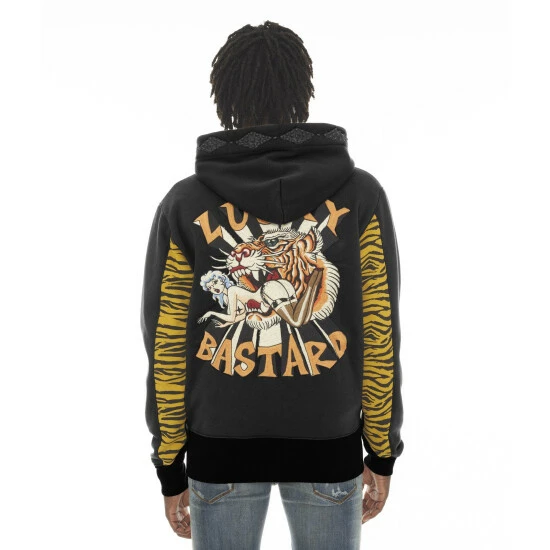 This black heavy full zip brushed fleece Hoody is the perfect throw-on for a cool relaxed look. Our “Lucky Bastard ” graphic features an embroidered back panel, western stud details on hood and pockets, tiger print pattern on the backs of sleeves and inside the hood, and patches on the front of the jacket.