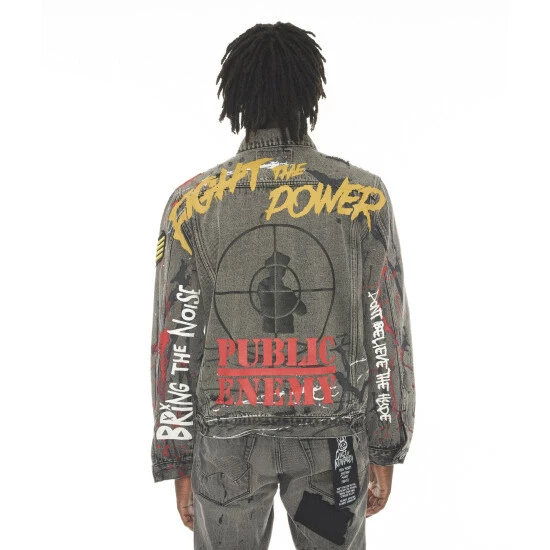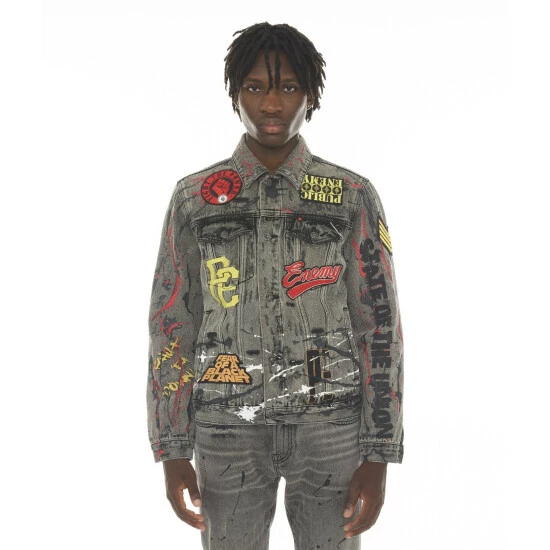 This stretch black type 2 denim jacket is crafted from premium denim. It features the cult signature selvage trim. Texture and dimension are created through the embroidered graphics on the front and back and embroidered patches on the front and both sleeves, as well as paint splatter pattern and painted quotes that encompass the jacket.