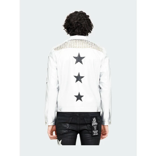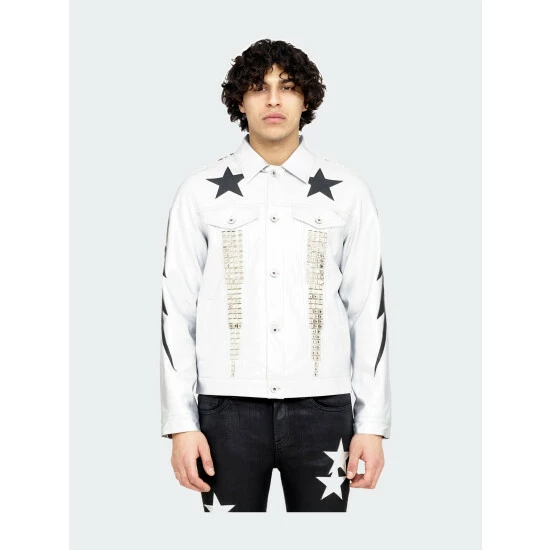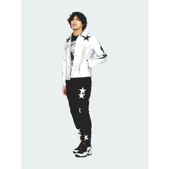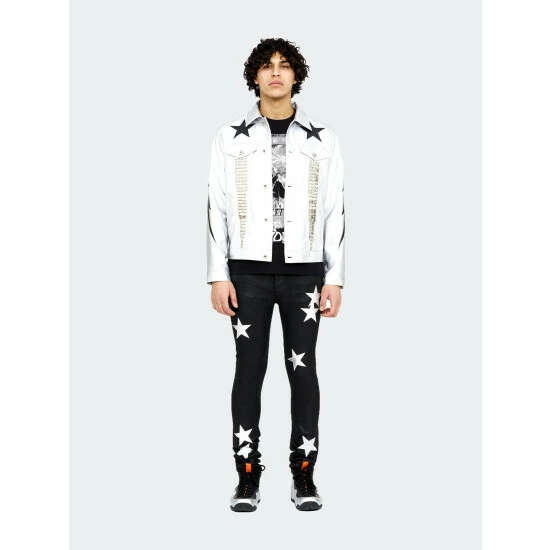 This classic type 2 denim jacket is crafted from a unique silver vegan leather fabric with black vegan leather star appliques and silver metal studs.