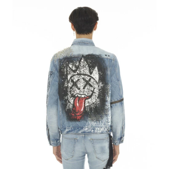 This stretch light blue type 5 denim jacket is crafted from premium denim. It features the Cult signature selvage trim and graphics on both the front and back of the jacket; as well as studs on the front left shoulder, and “XX” embroidery on the back right shoulder. This jacket includes a front zipper with hidden pockets as well as zippers on the elbows.